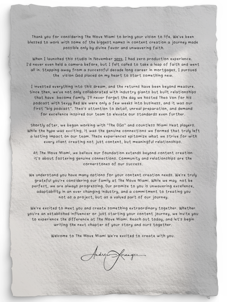 Thank you for considering The Move Miami to bring your vision to life. We’ve been blessed to work with some of the biggest names in content creation—a journey made possible only by divine favor and unwavering faith.